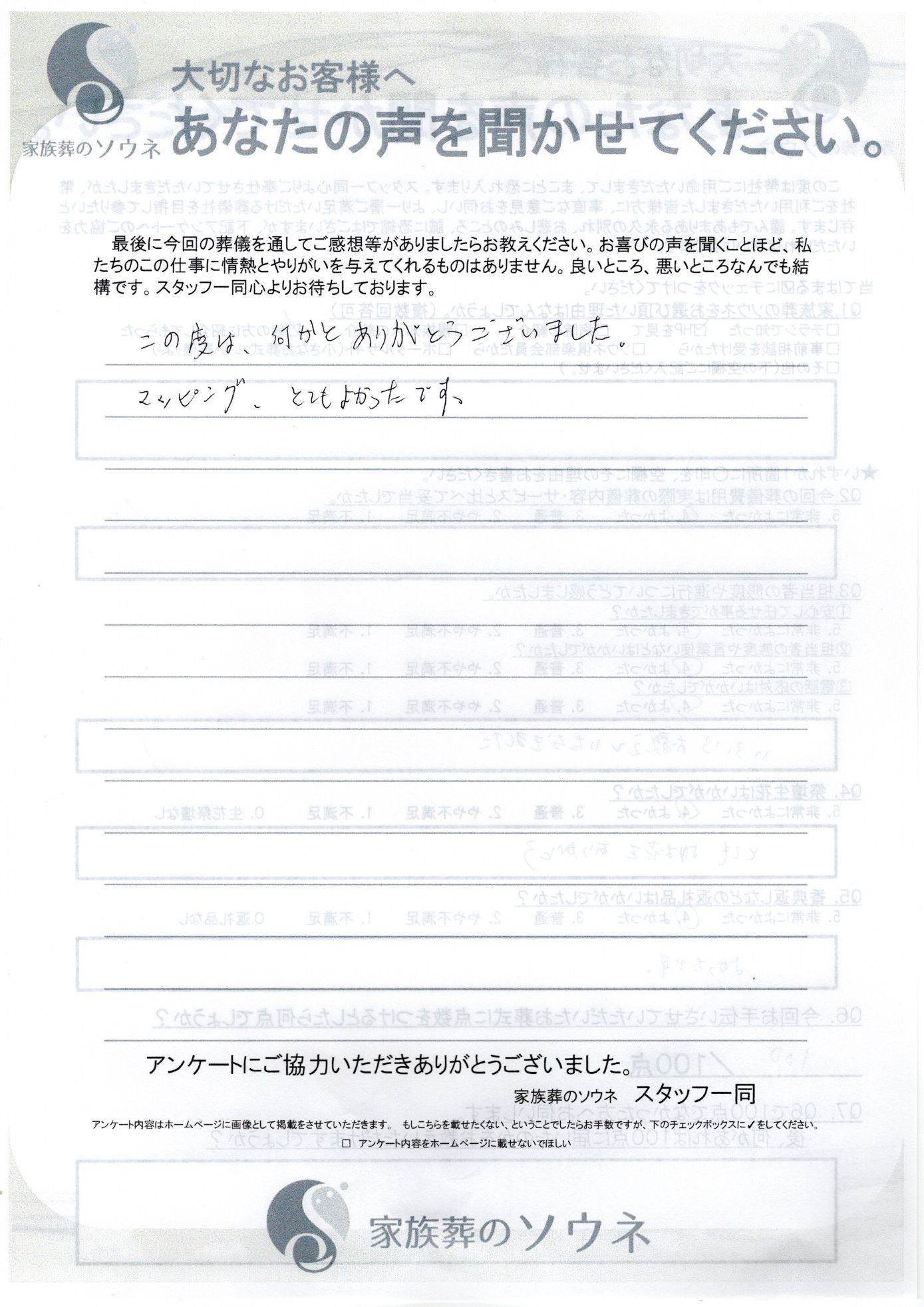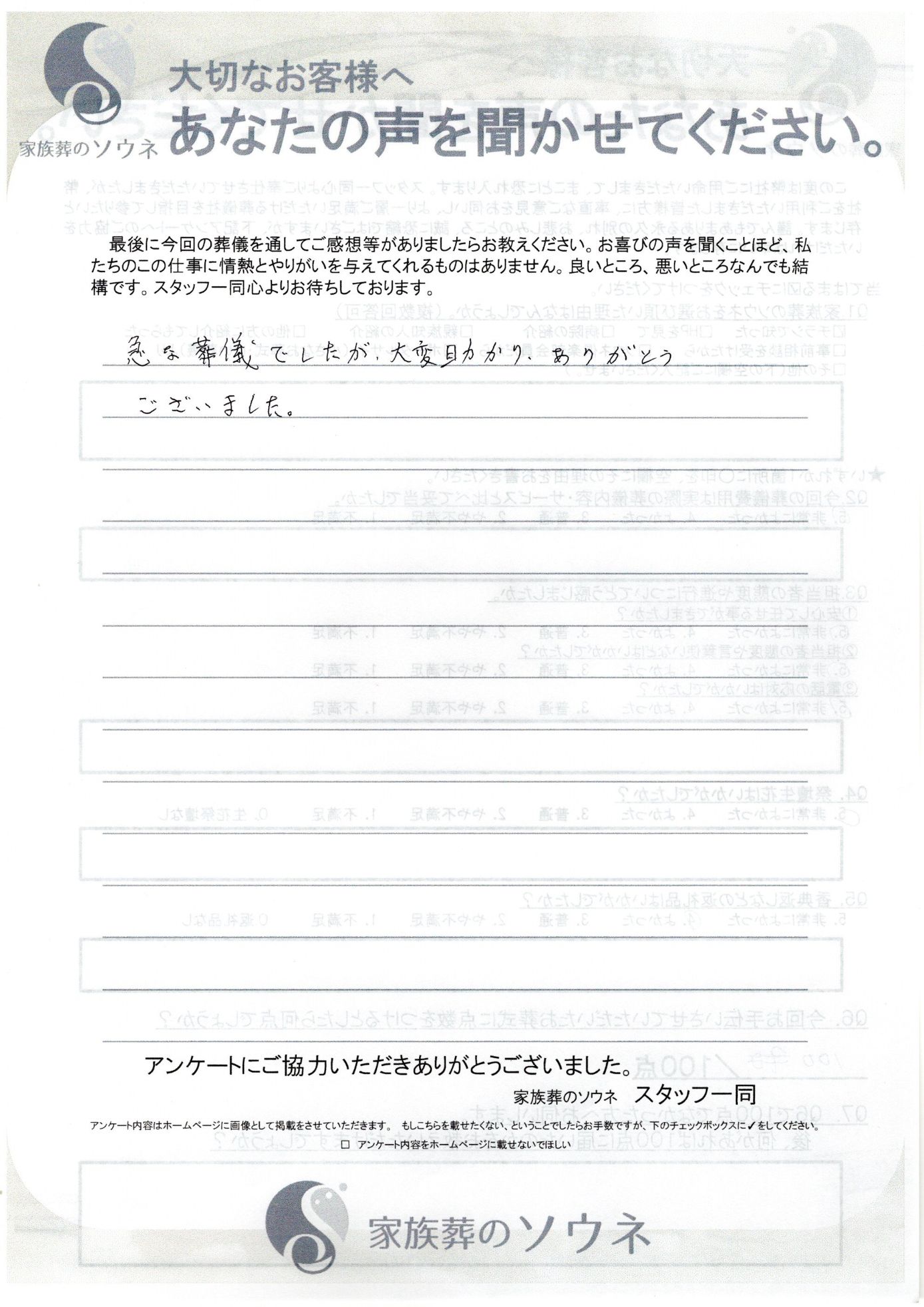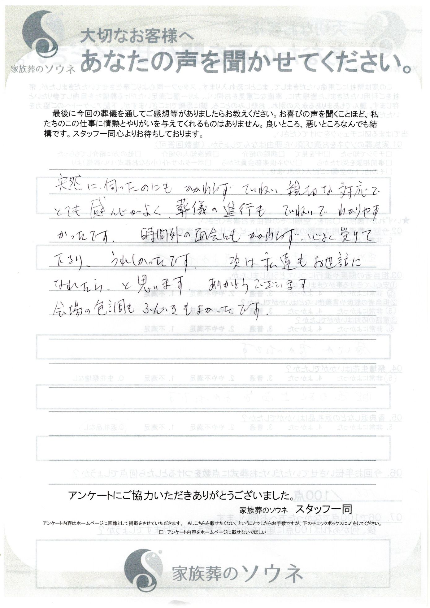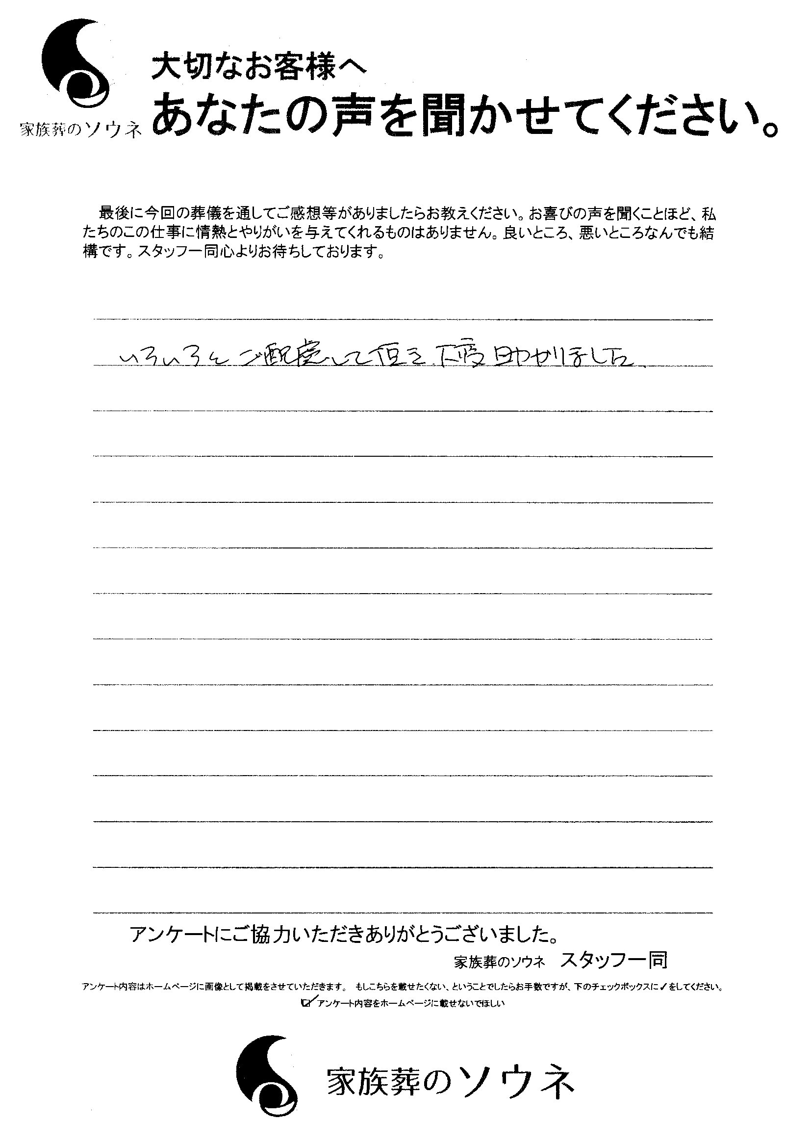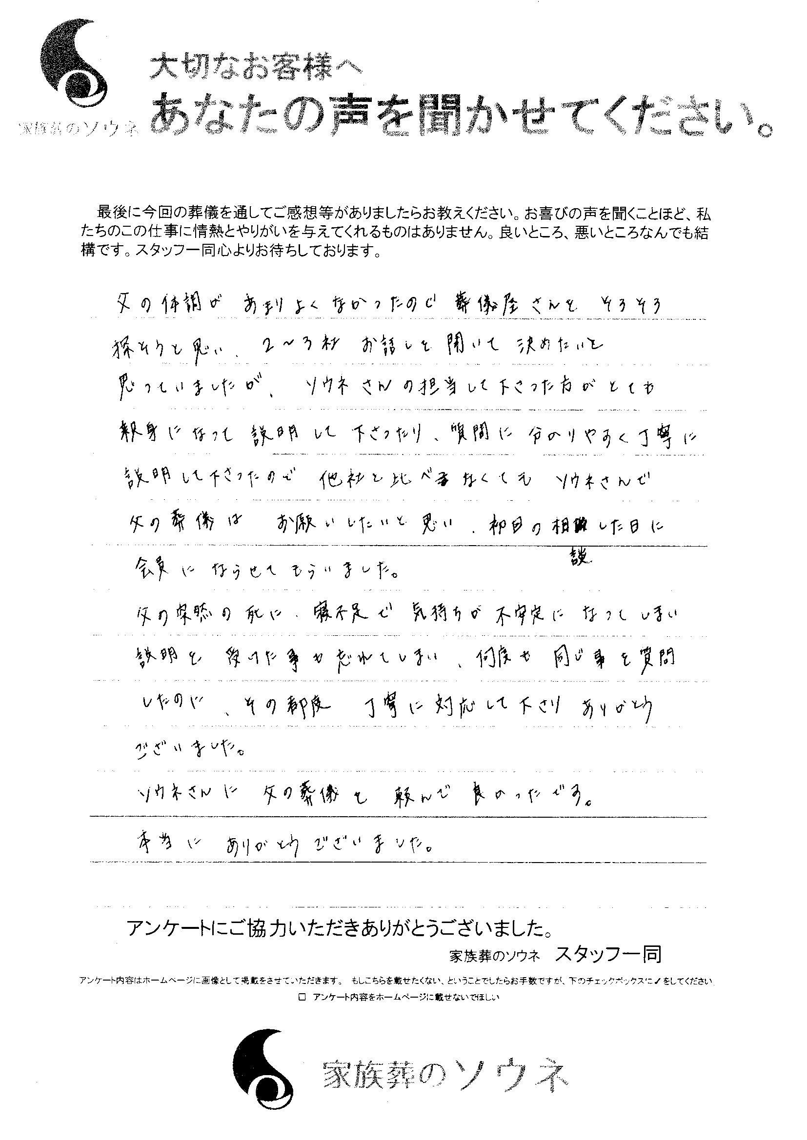 家族葬ソウネでご葬儀をして頂いたお客様の声です。