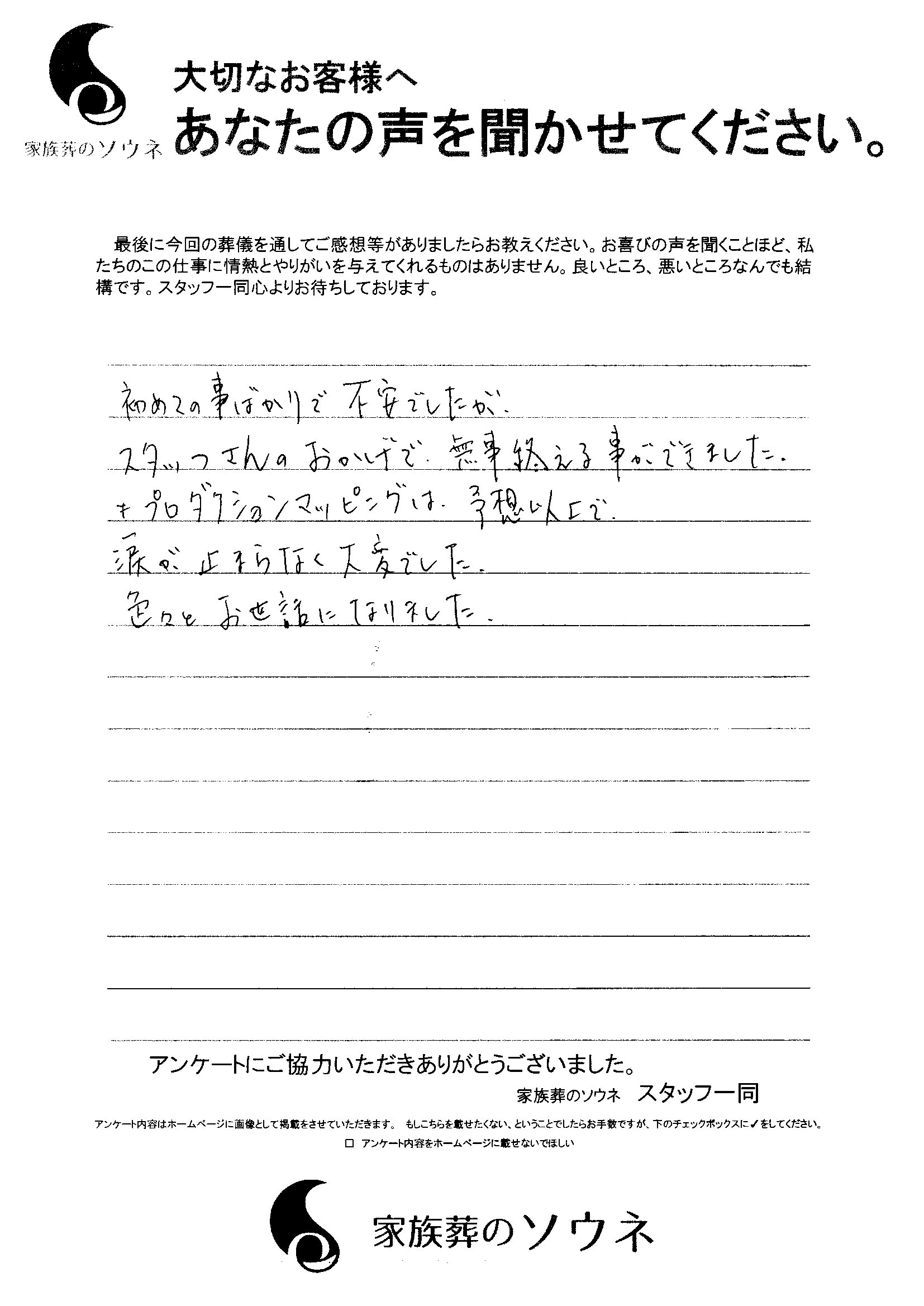 プロジェクションマッピングがとても感動的でした。常に優しい対応をして下さり、ありがとうございました。とのお言葉をいただきました。誠にありがとうございます。とても励みになります。また、この度は大切な故人様とのお別れのお手伝 […]