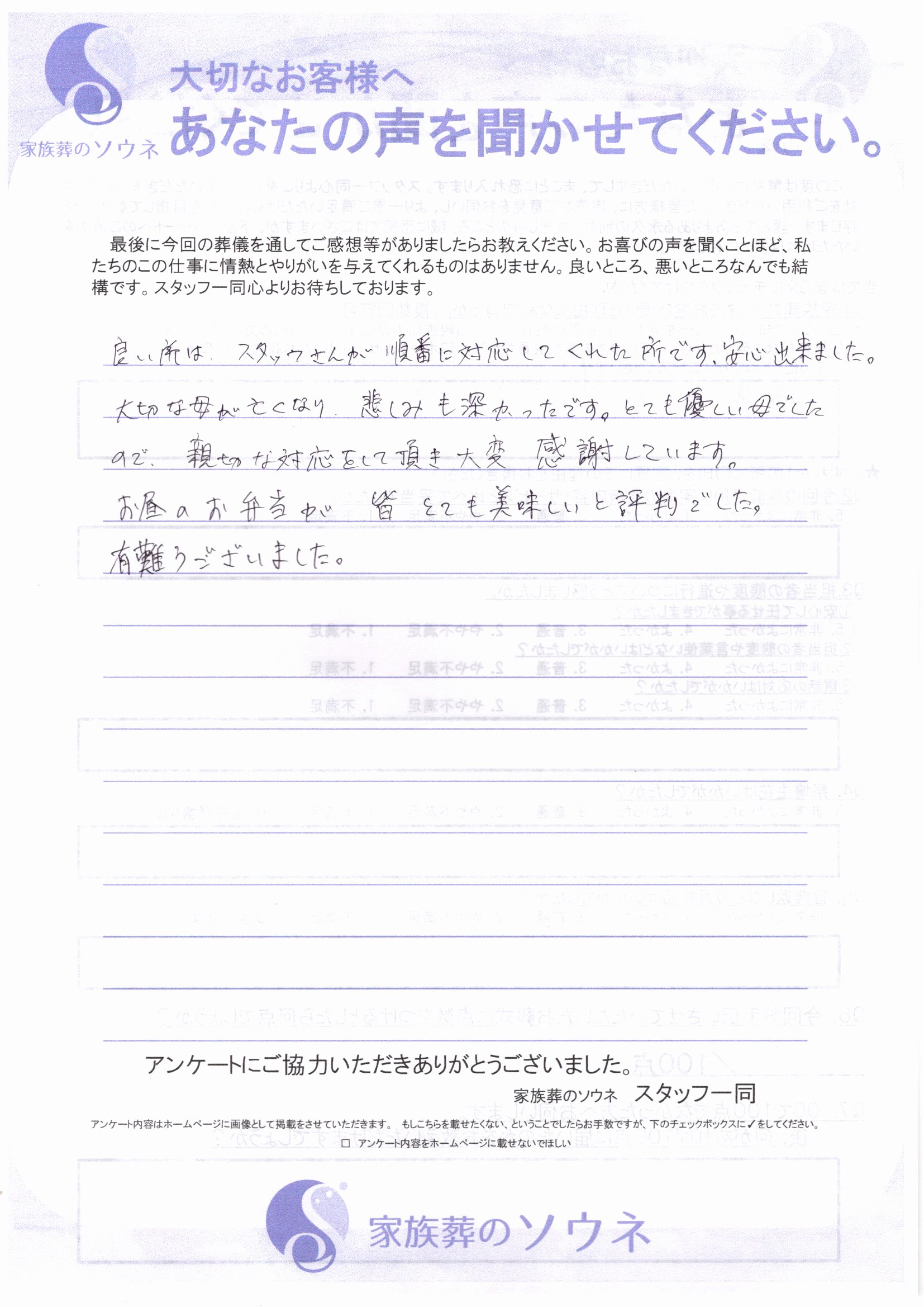 この度は大変お世話になりました。お世話になるほんの数日前にソウネさんをお訪ねし、プランの事等ご説明いただいておりましたので、あわてることなくその日を迎えることができました。色々とありがとうございました。とのお言葉をいただ […]