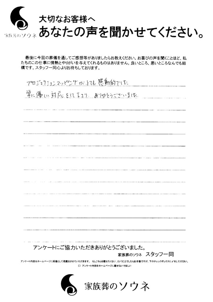 プロジェクションマッピングがとても感動的でした。常に優しい対応をして下さり、ありがとうございました。