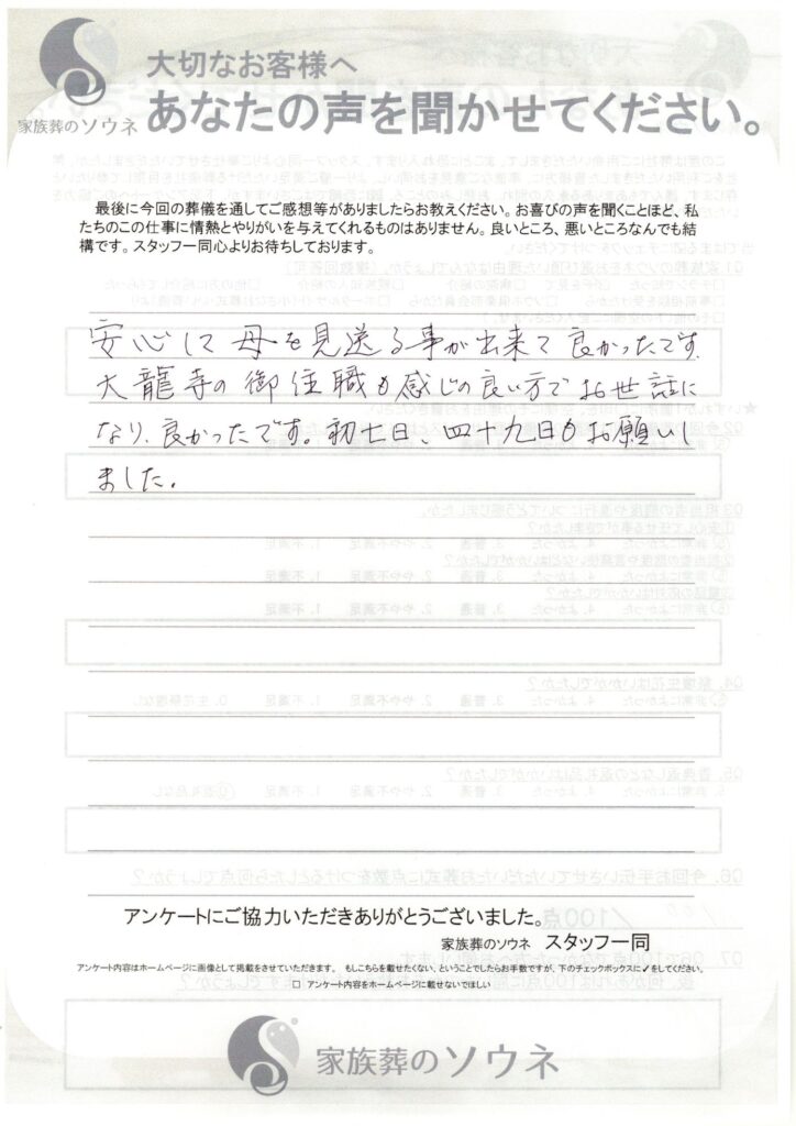 安心して母を見送る事が出来て良かったです。大龍寺の御住職も感じの良い方でお世話になり、良かったです。初七日、四十九日もお願いしました。