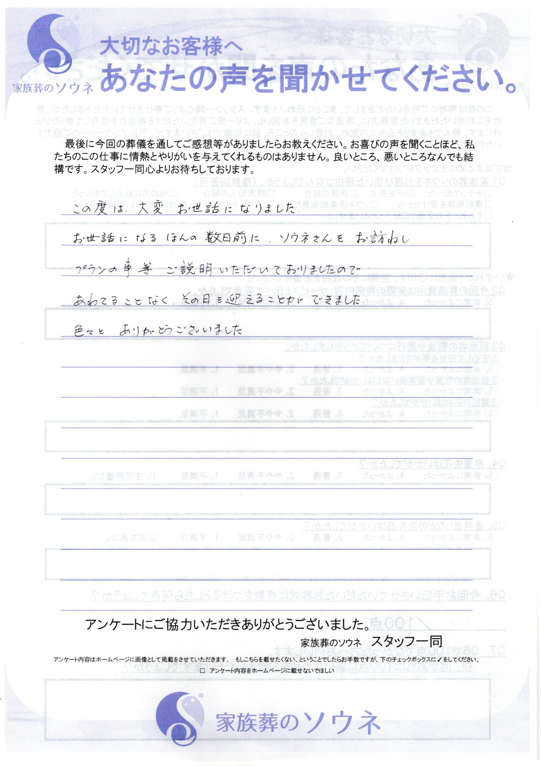 この度は大変お世話になりました。お世話になるほんの数日前にソウネさんをお訪ねし、プランの事等ご説明いただいておりましたので、あわてることなくその日を迎えることができました。色々とありがとうございました。とのお言葉をいただ […]
